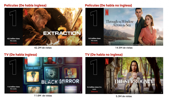 Por segunda semana consecutiva, Chris Hemsworth dominó los dos primeros puestos de la lista de películas de habla inglesa, ya que Misión de Rescate 2 se mantuvo fuerte en el primer lugar con 42.2 millones de vistas, convirtiéndose en el título más visto de Netflix esta semana. Mientras algunos fans visitaban las vallas publicitarias de Tyler Rake, otros revisitaron su pasado, ya que la primera entrega de Misión de Rescate tomó el segundo puesto, con 13.8 millones de vistas esta semana. La franquicia Misión de Rescate obtuvo 108.4 millones de vistas desde el 12 de junio, lo que la convierte en la primera franquicia cinematográfica en ocupar los dos primeros puestos durante dos semanas. El documental Cuiden a Maya ocupó el tercer puesto de la lista con 9.2 millones de vistas. Los fans encontraron su pareja perfecta en la comedia romántica La combinación perfecta, basada en la novela de Tia Williams, protagonizada por Gabrielle Union y Keith Powers, con 7 millones de vistas.