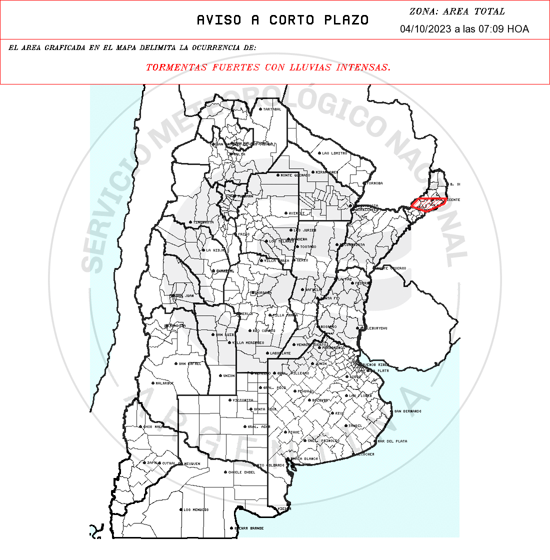 urn:oid:2.49.0.0.32.0.2023.10.04.10.09.00smn@smn.gov.ar2023-10-04T10:09:00-03:00ActualAlertPublic Met TORMENTAS FUERTES CON LLUVIAS INTENSAS – AVISO NARANJAImmediateSevereObserved2023-10-04T12:09:00-03:00SERVICIO METEOROLOGICO NACIONAL – ARGENTINAAVISO NARANJA POR TORMENTAS FUERTES CON LLUVIAS INTENSAS — — https://ssl.smn.gob.ar/feeds/CAP/avisocortoplazo/2023_10_04_1009_cap_es.xmlMISIONES: 25 DE MAYO – CAINGUAS – CANDELARIA – GUARANI – LDOR GRAL SAN MARTIN – MONTECARLO – OBERA – SAN IGNACIO – SAN PEDRO. -26.93,-55.25 -26.91,-53.69 -27.18,-53.84 -27.58,-54.82 -27.30,-55.62 -26.93,-55.25