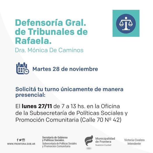 Los ciudadanos interesados en recibir asistencia legal de la Dra. Mónica De Caminos pueden acercarse a la Oficina de la Subsecretaría de Políticas Sociales y Promoción Comunitaria (ubicada en Calle 70 N° 42) el día 27 de noviembre desde las 7 am.