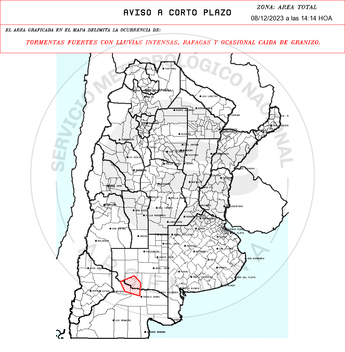 urn:oid:2.49.0.0.32.0.2023.12.08.17.14.00smn@smn.gov.ar2023-12-08T17:14:00-03:00ActualAlertPublic Met TORMENTAS FUERTES CON LLUVIAS INTENSAS, RAFAGAS Y OCASIONAL CAIDA DE GRANIZO – AVISO NARANJAImmediateSevereObserved2023-12-08T19:14:00-03:00SERVICIO METEOROLOGICO NACIONAL – ARGENTINAAVISO NARANJA POR TORMENTAS FUERTES CON LLUVIAS INTENSAS, RAFAGAS Y OCASIONAL CAIDA DE GRANIZO — — https://ssl.smn.gob.ar/feeds/CAP/avisocortoplazo/2023_12_08_1714_cap_es.xmlLA PAMPA: CURACO. RIO NEGRO: AVELLANEDA – GRAL ROCA. -38.28,-67.51 -37.87,-66.29 -38.34,-65.74 -39.24,-65.84 -38.94,-67.09 -38.28,-67.51