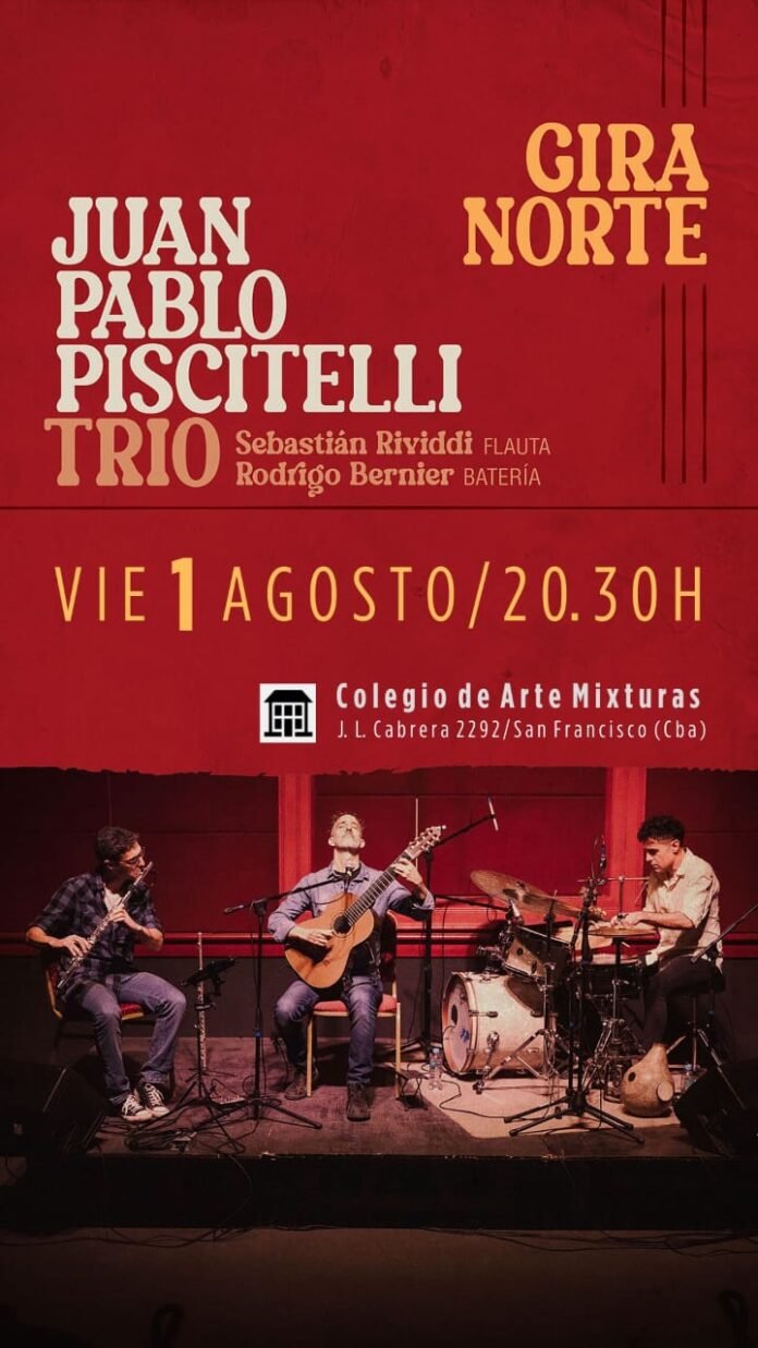 El talentoso guitarrista y compositor -oriundo de La Plata- Juan Pablo Piscitelli se presentará en el marco de su Gira Norte junto a su trío, este viernes 1 de agosto a las 20:30 hs, en el Colegio de Arte Mixturas, ubicado en J. L. Cabrera 2292, en nuestra ciudad.