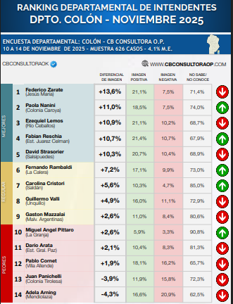 Los intendentes del dpto. Colón con mejor diferencial de imagen en este mes son: Paola Nanini de Colonia Caroya (+11,0%) y Ezequiel Lemos de Río Ceballos (+10,9%).
