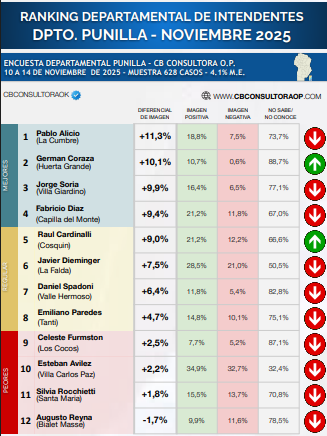Los intendentes del dpto. Punilla con mejor diferencial de imagen en este mes son: Pablo Alicio de La Cumbre, seguido por Germán Coraza de Huerta Grande (+10,1%) y Fabricio Díaz de Capilla dael Monte.