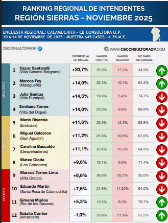 Los intendentes de la Región con mejor diferencial de imagen en este mes son: Oscar Santarelli de Villa General Belgrano (+18,7%) en primer lugar, seguido por Marcos Fey de Malagueño (+14,9%), y en tercer lugar Julio Gantus de Villa Rumipal (+14,5%).