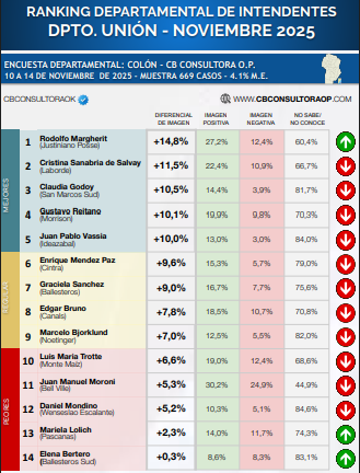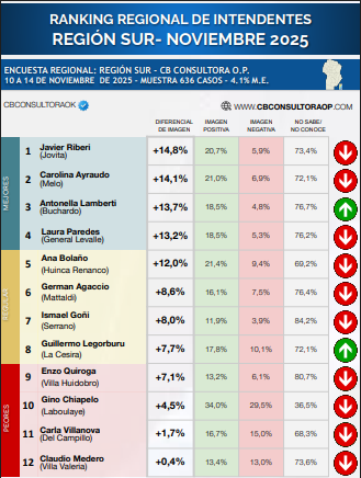 Los intendentes de la Región con mejor diferencial de imagen en este mes son: Javier Riberi de Jovita (+14,8%) en primer lugar, seguido por Carolina Ayraudo de Melo (+14,1%), y en tercer lugar Antonella Lamberti de Buchardo (+13,7%).