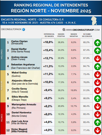 Se conoció una nueva medición de imagen de los Intendentes y Jefes Comunales de la provincia de Córdoba, en este caso referido al mes de noviembre de este año. La investigación realizada por CB Consultora relevó un total de 9159 casos en el total de la provincia, donde se consultó a los vecinos la imagen que tienen de su intendente, elaborando un ranking de mejor y peor preferencia, elaborado por regiones.