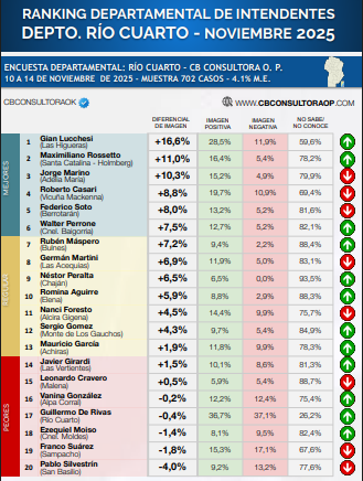 Los intendentes con peor diferencial del mes son: Claudio Medero de Villa Valeria (+0,4%) en último lugar, seguido por Carla Villanova de Del Campillo (+1,7%), y completa el podio negativo Gino Chiapello de Laboulaye (+4,5%).
