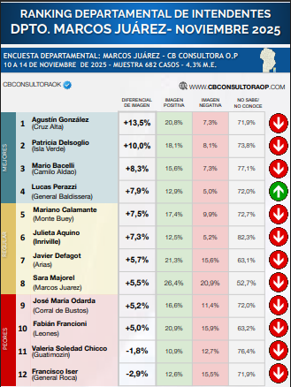 Los intendentes del dpto. Marcos Juárez con mejor diferencial de imagen en este mes son: Agustín González de Cruz Alta (+13,5%) en primer lugar, seguido por Patricia Delsoglio de Isla Verde (+10,0%), y en tercer lugar Mario Bacelli de Camilo Aldao (+8,3%).