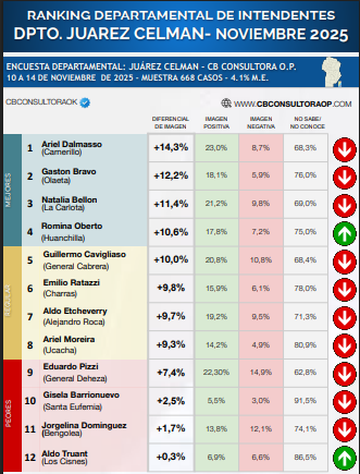 Los intendentes con peor diferencial del mes son: Gabriel Cañas de Ticino (+1,4%) en último lugar, seguido por Mariano Colombano de La Laguna (+2,9%), y completa el podio negativo Robert Meichtri de Chazón.