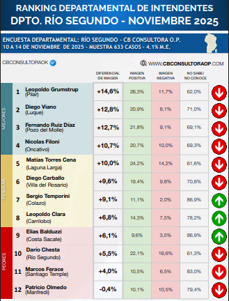 Los tres intendentes del dpto. Río Segundo con mejor diferencial de imagen en este mes son: Leopoldo Grumstrup de Pilar (+14,6%) en primer lugar, seguido por Diego Viano de Luque (+12,8%), y en tercer lugar Fernando Ruiz Díaz de Pozo del Molle (+12,7%).