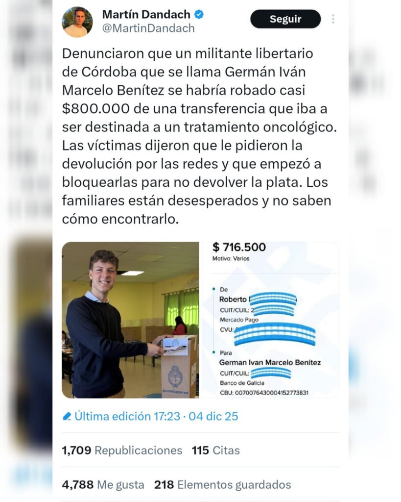 Hasta el dirigente Martín Dandach se hizo eco de la información y también la publicó en su feed de X, diciendo que los familiares de la persona enferma estaban desesperados pidiéndole a Benitez que devuelva el dinero.