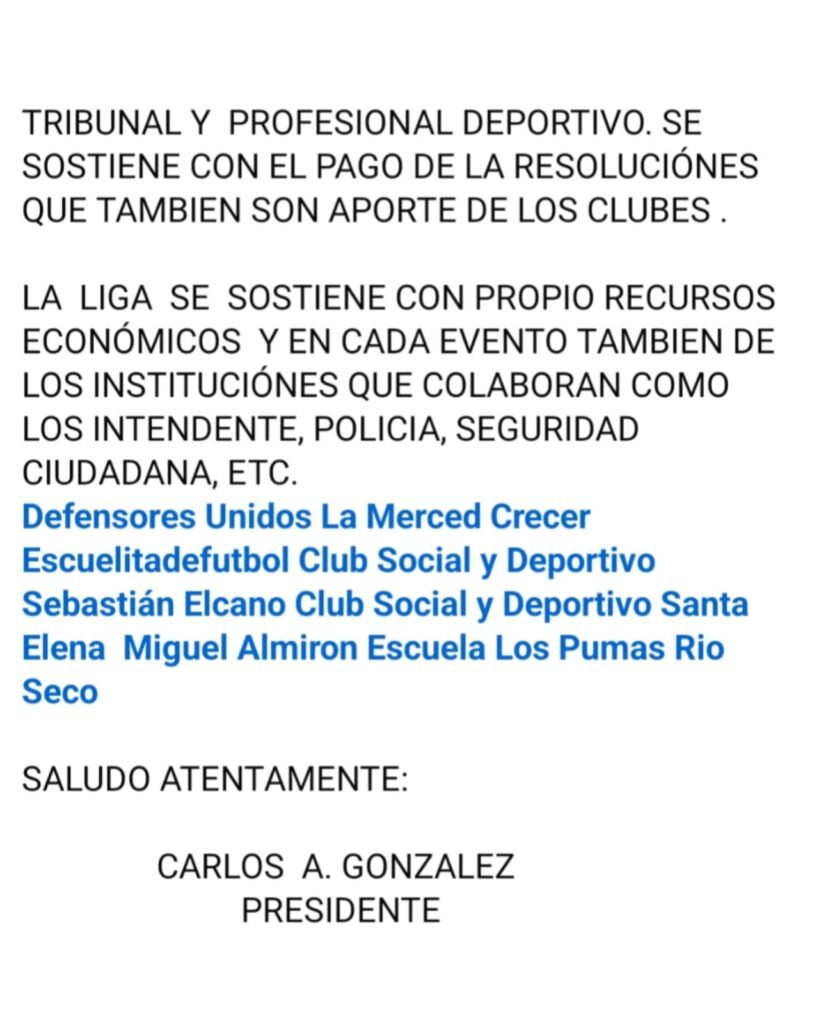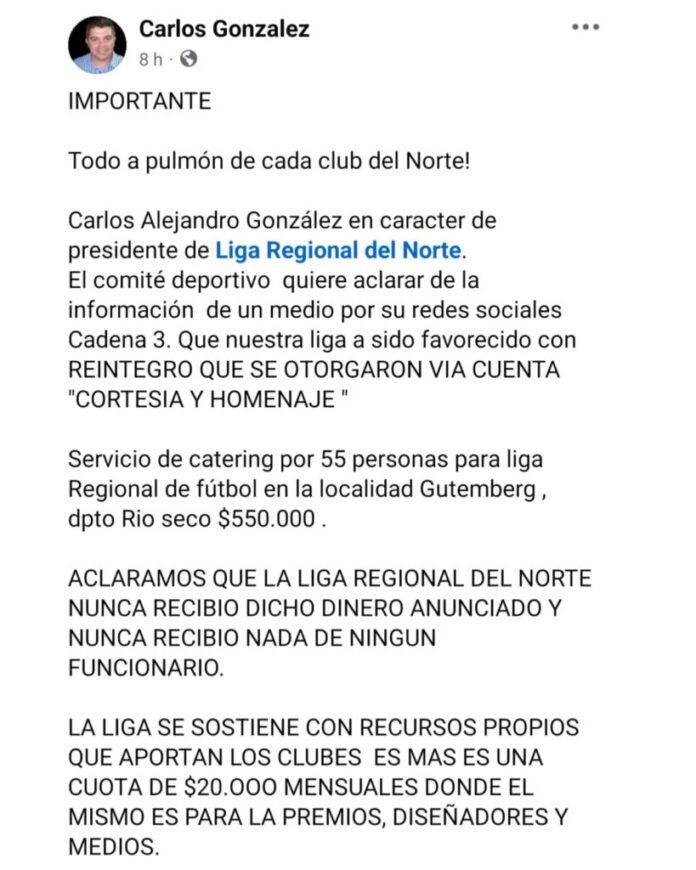 Carlos González, en representación de los clubes dijo a través de un posteo en redes sociales que todo lo hacen a pulmón. «Aclaramos que la liga regional norte nunca recibió dicho dinero anunciado y nunca recibió nada de ningún funcionario» (…) «La liga se sostiene con recursos propios que aportan los clubes, es más, es una cuota de $20.000 mensuales donde el mismo es para premios, diseñadores y medios», dijo González.
