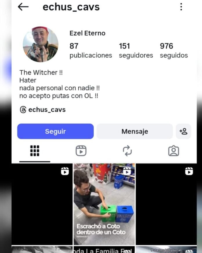 Se trata del usuario @Echus_Cavs «Ezel Eterno», su apellido es Díaz y sería de la Provincia de Buenos Aires. En su bio de Instagram, el usuario se denomina «hater», aclara que nada es personal con nadie y agrega que no acepta «putas con OL». Está activo en esta red social desde el año pasado y tiene varios posteos: fotos suyas, videos random e incluso un momento en el que está celebrando su cumpleaños.