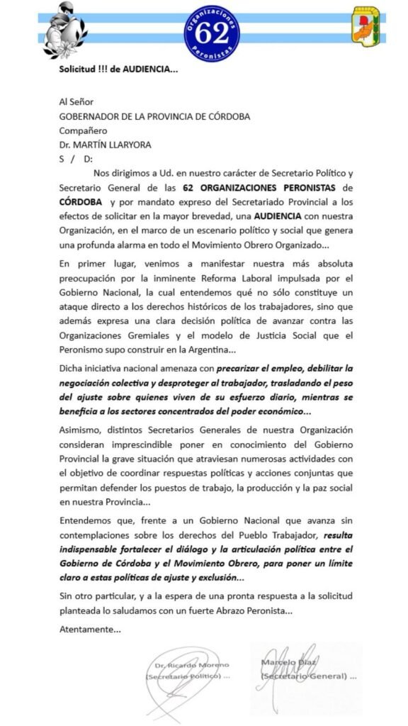 Las 62 Organizaciones Peronistas lideradas por Marcelo Diaz y Ricardo Moreno en la últimas hora de ayer, despues de la reunión de su secretariado, emitieron un comunicado donde resolvieron pedirle una audiencia al Gobernador Martín Llaryora.