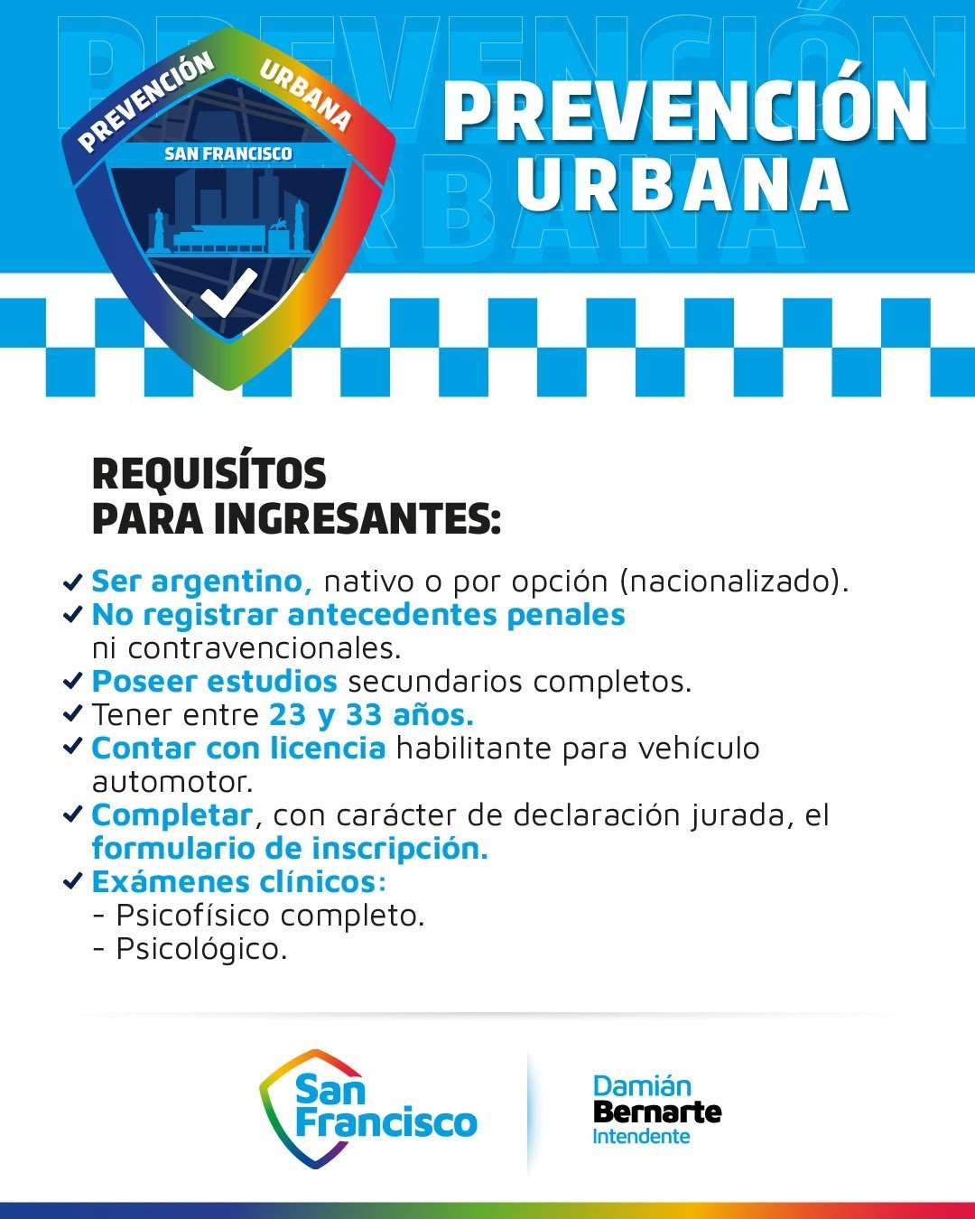 Entre los requisitos de inscripción se destacan: tener entre 19 y 33 años, secundario completo, domicilio en San Francisco (o residencia mínima de dos años), no poseer antecedentes penales y contar con licencia de conducir categorías A y B.